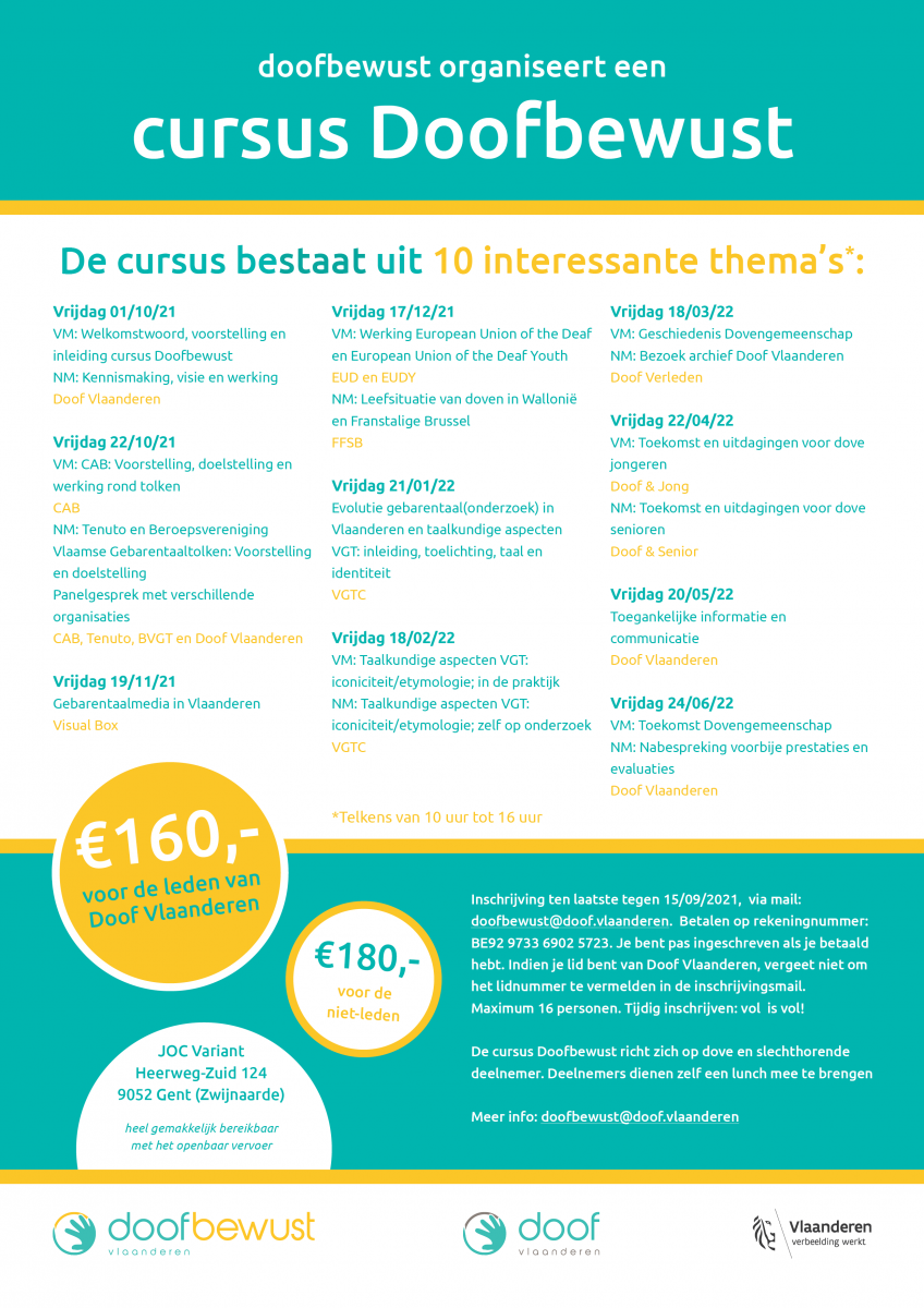 Inschrijven kan door een mail te sturen naar doofbewust@doof.vlaanderen voor 15 september. Je bent pas ingeschreven eens je het inschrijvingsgeld hebt betaald. Doe dit zo snel mogelijk, er is namelijk een maximum van 16 deelnemers.