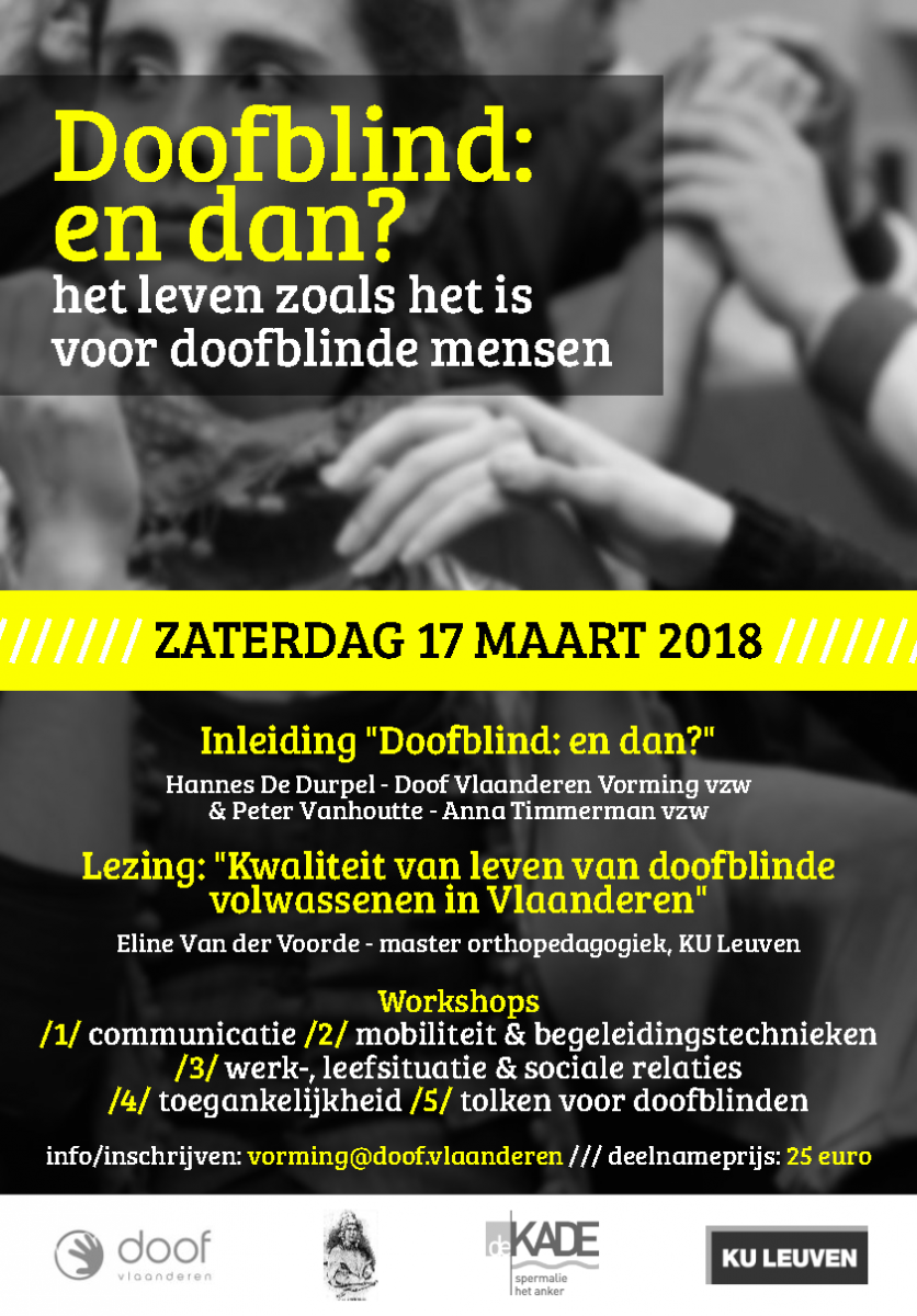 Op zaterdag 17 maart 2018 organiseert Doof Vlaanderen, in samenwerking met Anna Timmerman, begeleidingscentrum De Kade en KU Leuven een studiedag “Doofblind: en dan?” in Antwerpen van 9.30 tot 17.30 uur.